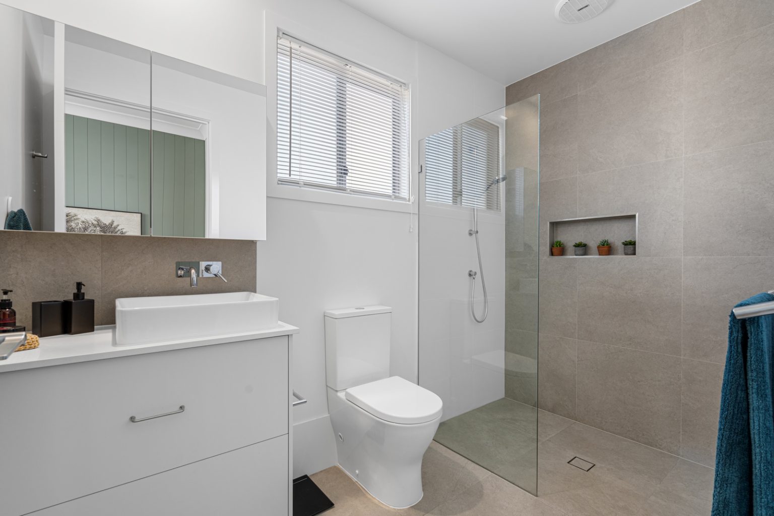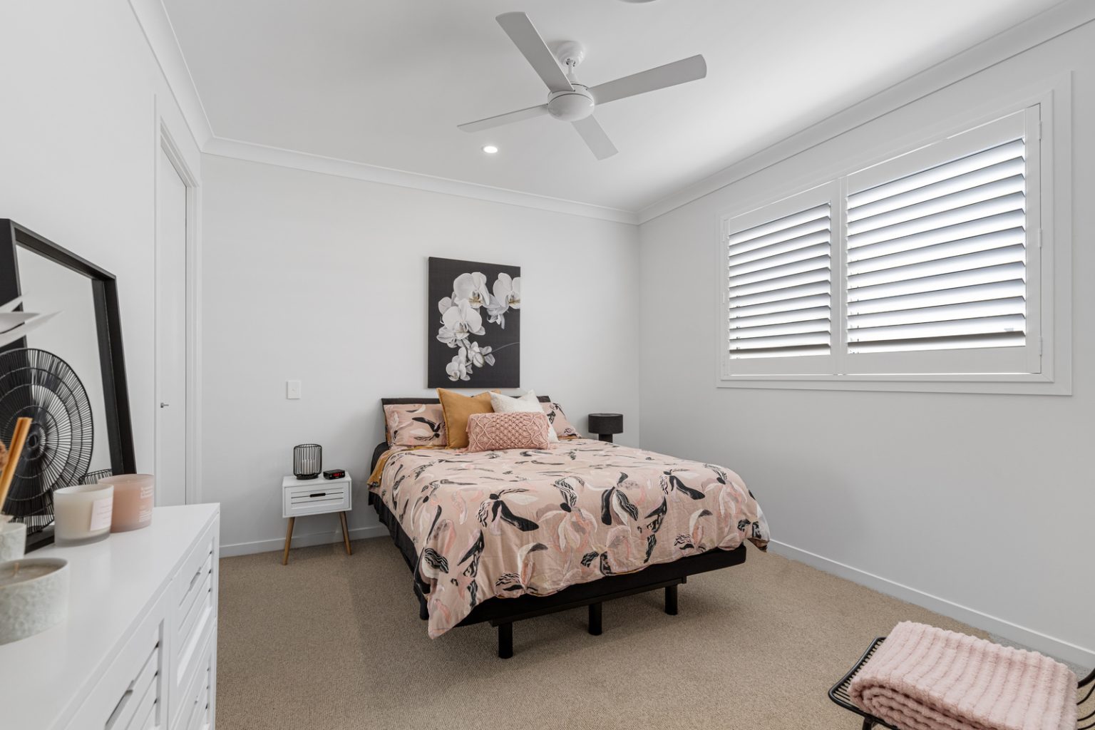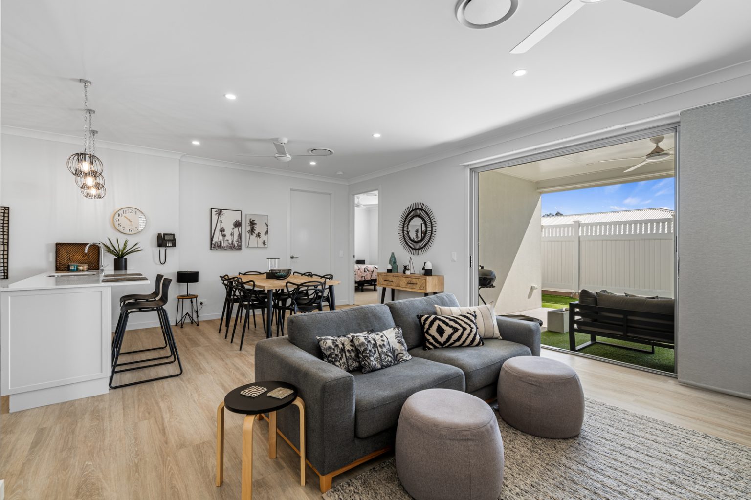 The sleek kitchen boasts stone benchtops, integrated appliances, and a suite of premium features including pendant lighting and stylish cabinetry. Step outside to the northeast-facing alfresco area, complete with outdoor fan, and modern ZipTrack blinds, perfect for private entertaining or relaxation.