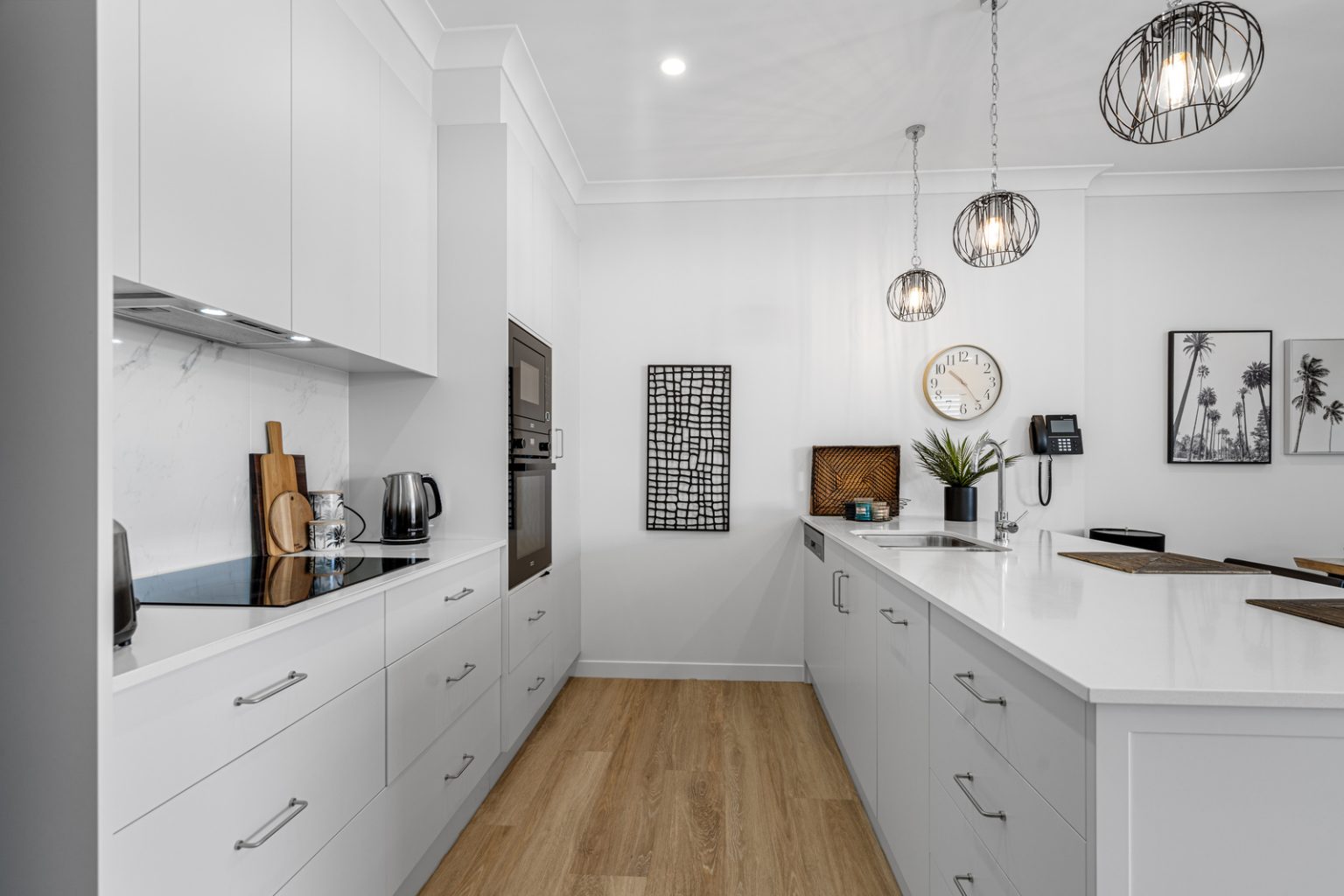 High ceilings and hybrid timber flooring complement the bright, open-plan living, kitchen and dining areas, creating an inviting space for relaxation or entertaining. Ducted air-conditioning and plantation shutters throughout ensure comfort and privacy within.
